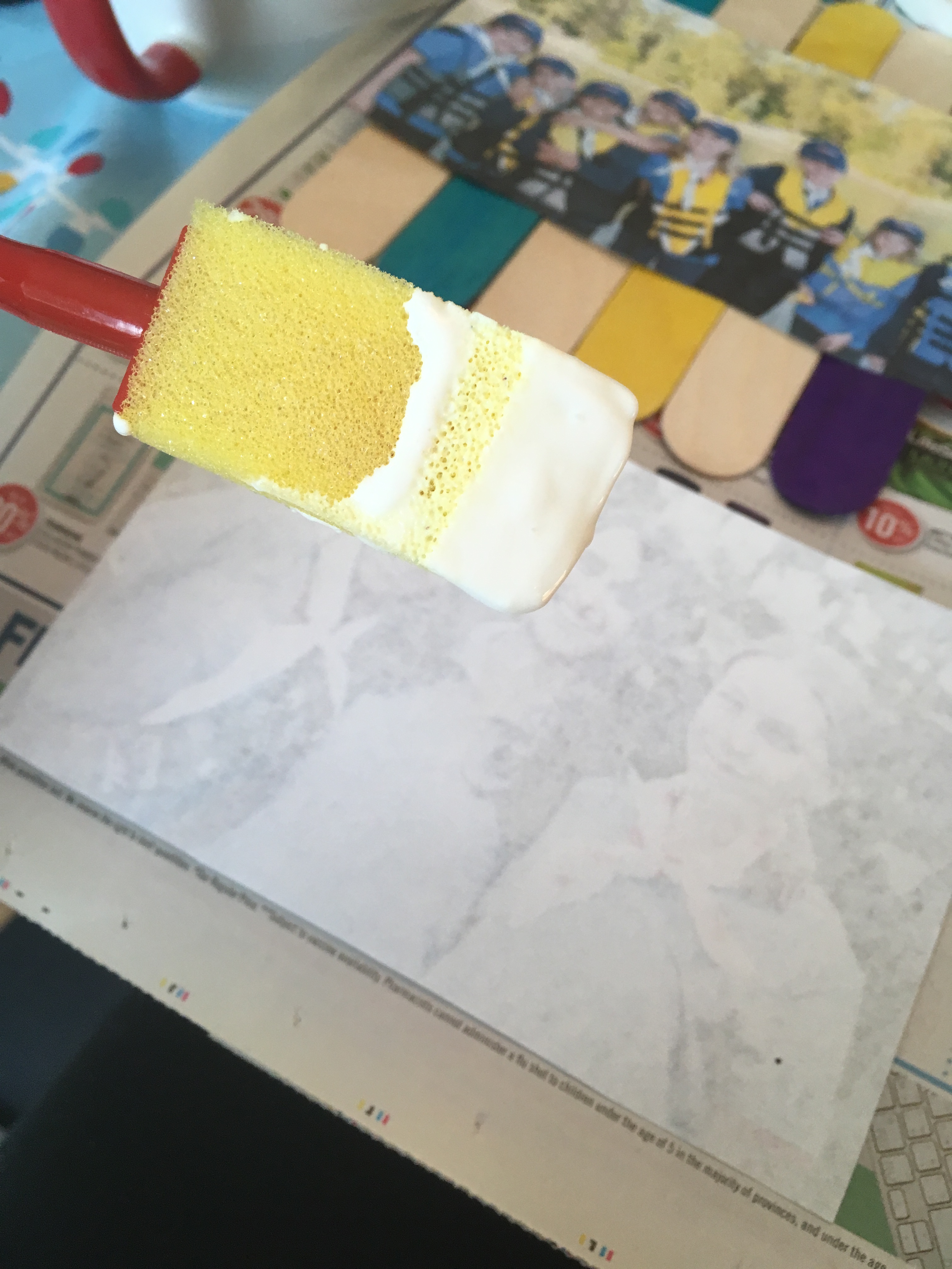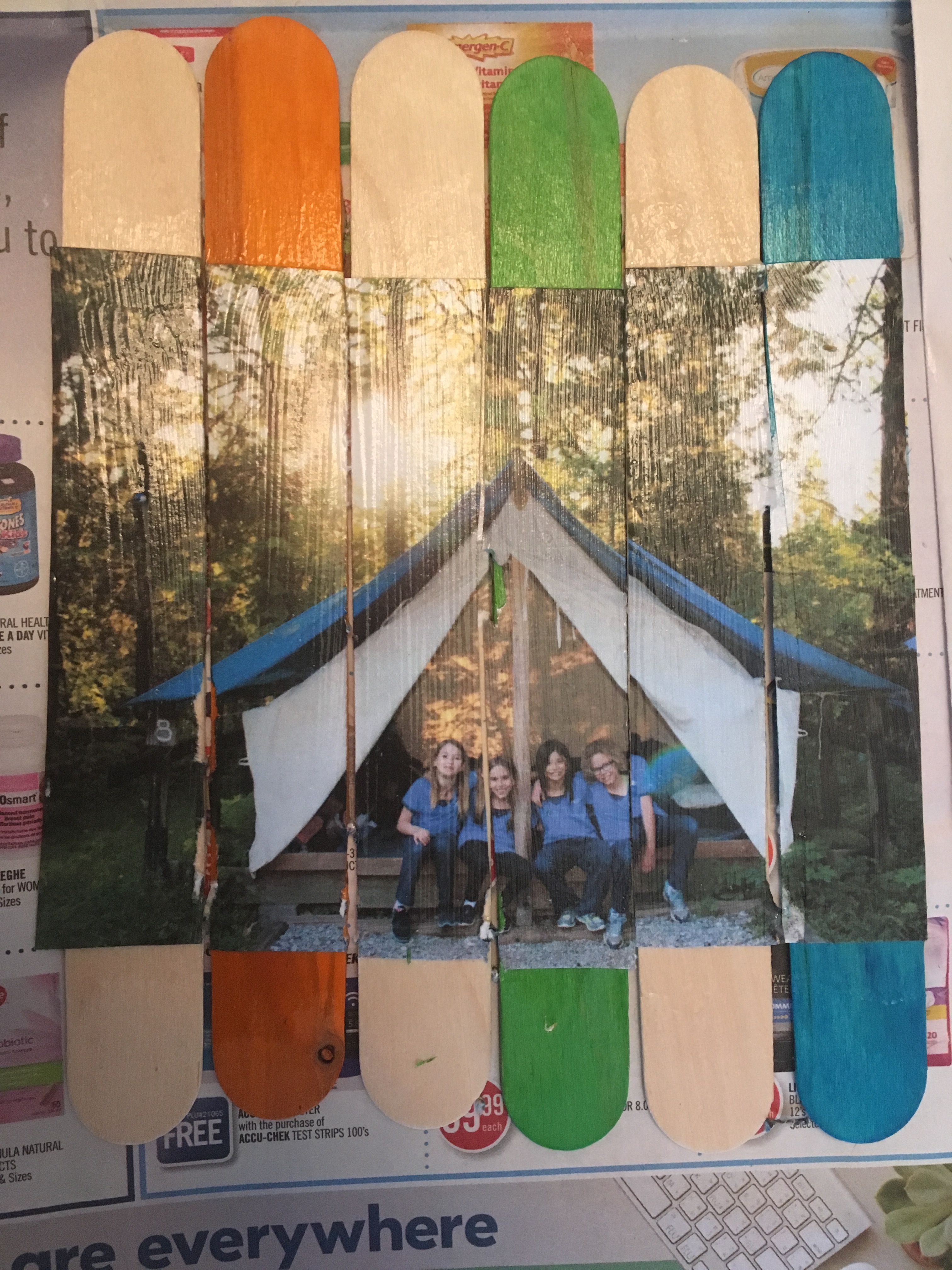 Next, I put a think layer of modpodge Gloss on the back of the picture and laid it on top of my sticks:
