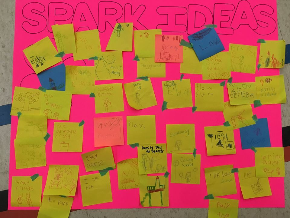 Then I gave each Spark a few standard Post-It notes and asked them to write or draw what they want to do in Sparks this year. I asked them to put down any goals they had, or things they wanted to try, any interests or favourite things. As you might imagine, I got a lot of pictures of candy, unicorns and playgrounds. Which is great! That’s easy to work with! I also got lots of pictures about family and books and helping people,