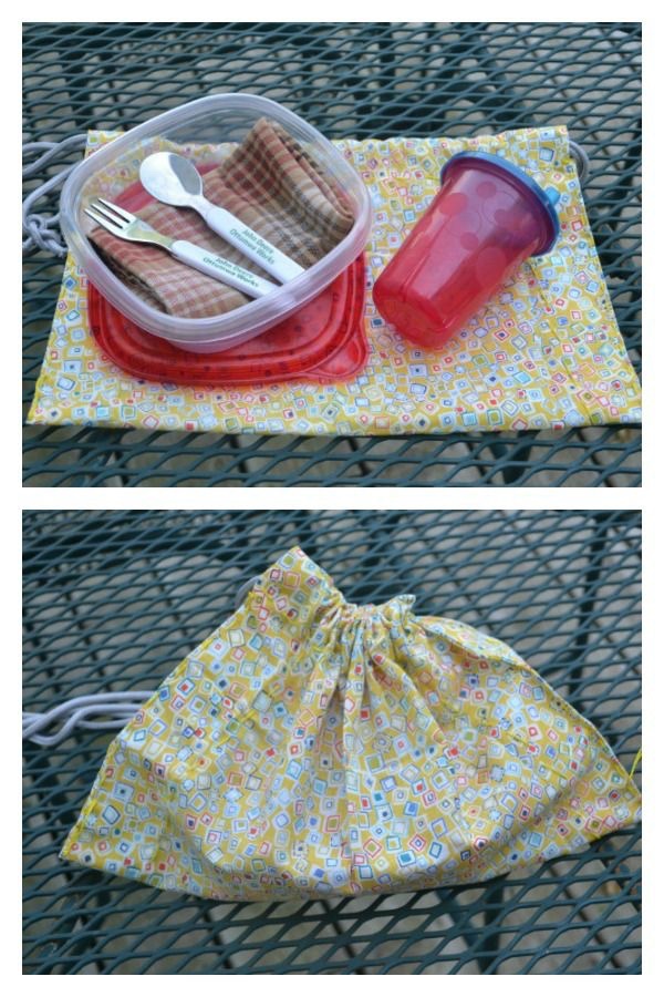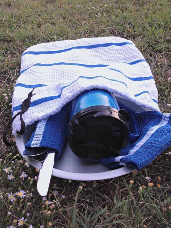 These items are usually placed in a tea town sewn up into a cinch-bag or mesh laundry bag. Anything that can be hung up on a clothesline with the items inside to dry after the camper has washed her dishes.