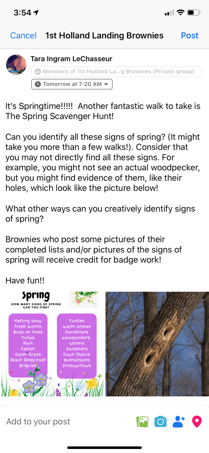 When I first wrote about the Spring Scavenger Hunt we were in very different times! Still, this Scavenger Hunt could be easily adapted to our current situation! Use the discussion tips to guide your instructions to your girls on your various Virtual Platforms instead!