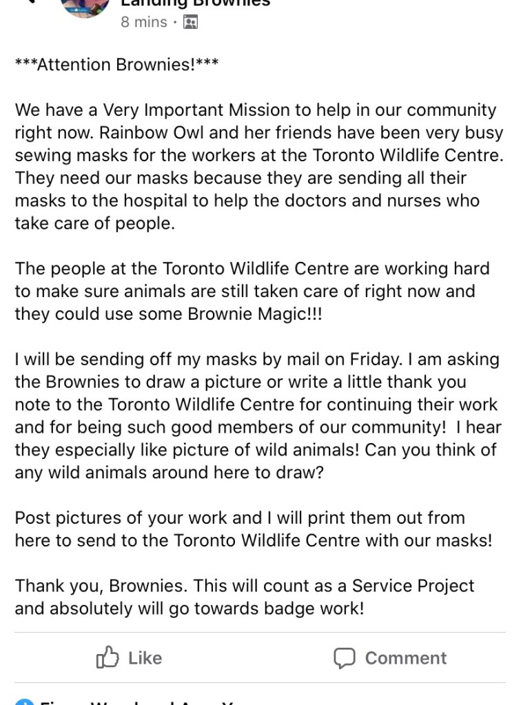 Guiders! Let me know what you are working on to help with the effort! Also, if you can sew and have time to make masks for vet clinics, tattoo parlours, etc., let me know if I can add you to my list! We are getting busy!!