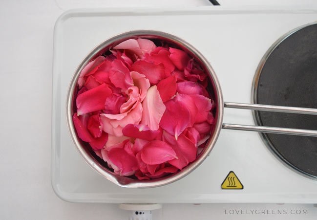 Instructions on how to make rose water toner using fresh rose petals. Use it directly on your skin or blend it with oils to create creams & lotions — Read on lovelygreens.com/how-to-make-rose-water-toner/