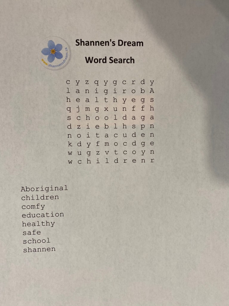 | Gathering | Shannen’s Dream Word Search | RO | Different Together, Gender Power, Canadian Connections, Your Voice | Shannen’s Dream word Search | 5-10 min |