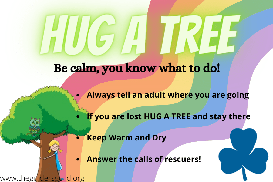 The Brownies were taking a walk in the enchanted forest when (Brownie Name) became separated from the group. No one noticed. The Brownies walked on and (Brownie Name) tripped and fell. no one noticed that she was left behind. (Brownie Name) wandered off to chase a butterfly and (Brownie Name) thought she heard someone calling her from the other direction. (TWO Brownie Names) were so busy talking, they fell behind and couldn’t catch up. When a mosquito bit (Brownie Name) she went back alone to get insect repellent and lost her way. (Brownie Name) turned back alone to look for her. (Brownie Name) was so busy smelling the flowers that she was left behind. Finally there was no one left except the leaders and they were very worried about all the lost Brownies. They went back through the enchanted forest calling their names (Guiders/Jr. Leaders call each Brownie’s name and she stays at her tree yelling (or using her whistle loudly until a Guider/Jr. Leader comes for her). They found every girl because the Brownies knew to hug a tree and wait for help!